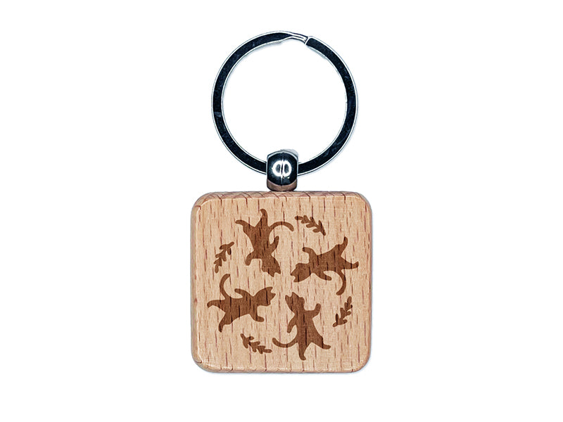 Dancing Walking Cats Pattern Engraved Wood Square Keychain Tag Charm