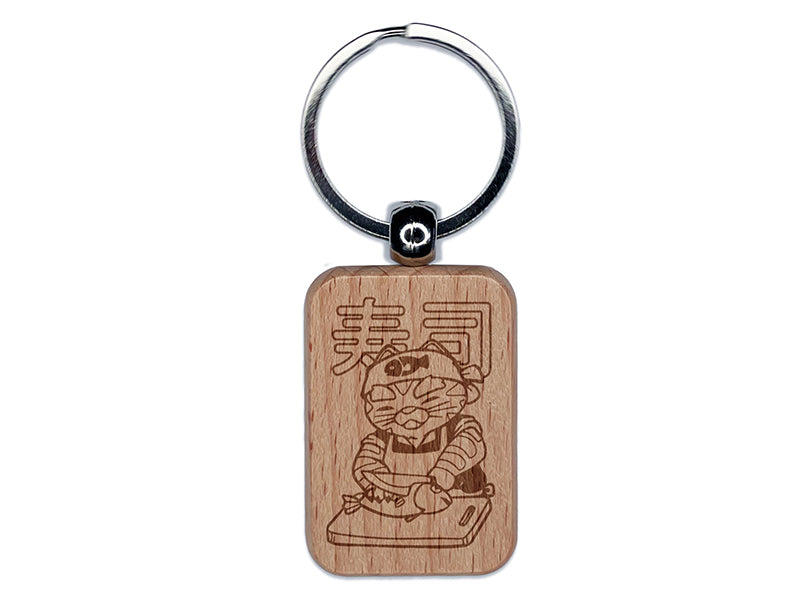 Sushi Chef Cat Cutting Fish Engraved Wood Rectangle Keychain Tag Charm