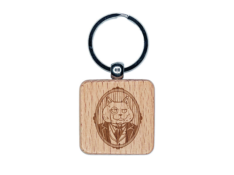 Victorian British Shorthair Cat Portrait Engraved Wood Square Keychain Tag Charm