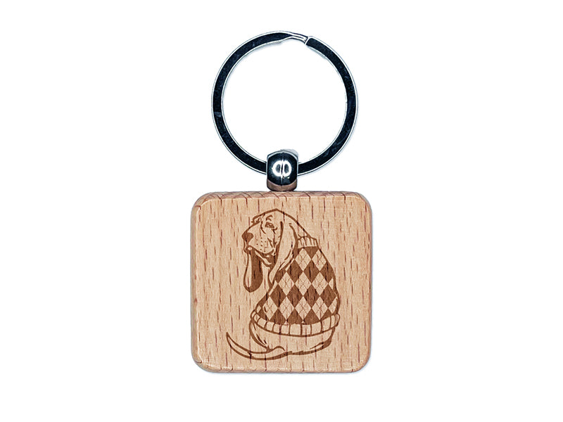 Basset Hound Dog in Argyle Sweater Engraved Wood Square Keychain Tag Charm