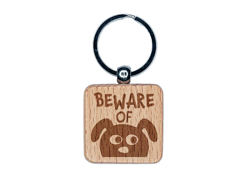 Beware of Dog Funny Doodle Engraved Wood Square Keychain Tag Charm
