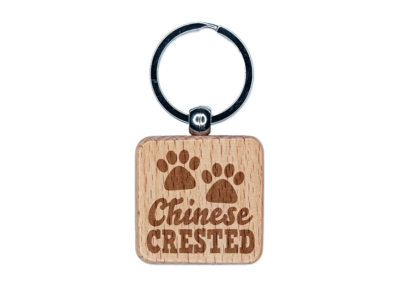 Chinese Crested Dog Paw Prints Fun Text Engraved Wood Square Keychain Tag Charm
