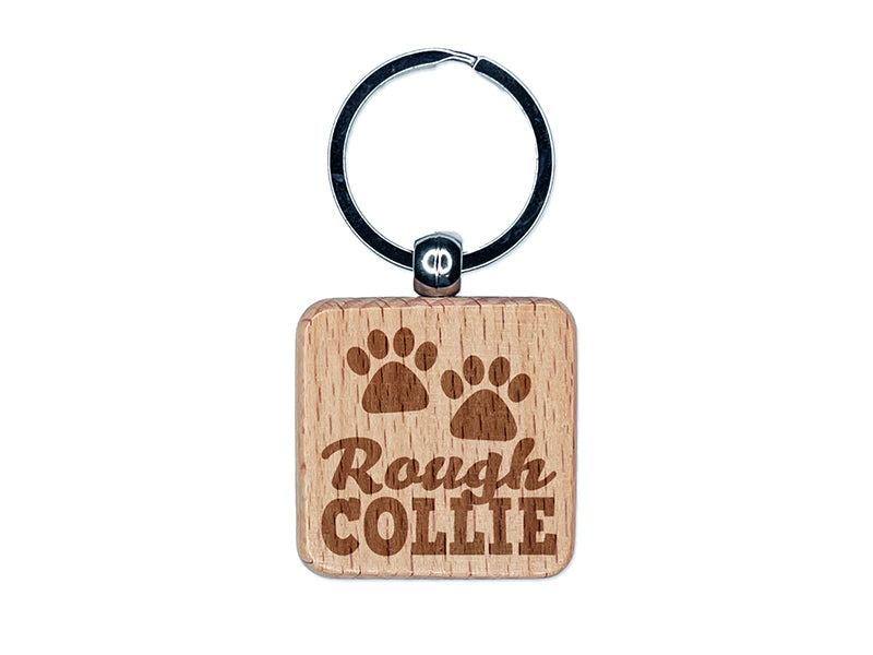 Rough Collie Dog Paw Prints Fun Text Engraved Wood Square Keychain Tag Charm
