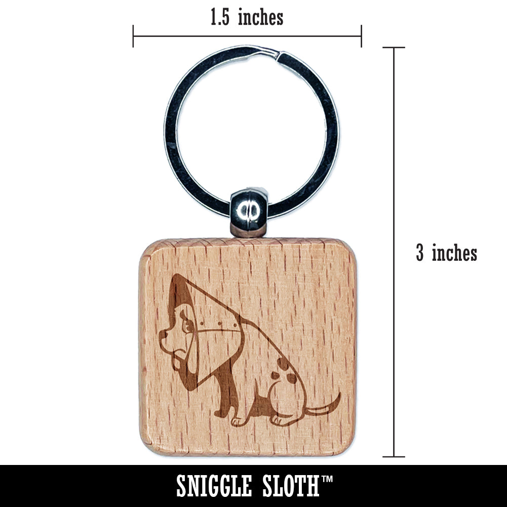 Sad Pet Dog in Cone of Shame Engraved Wood Square Keychain Tag Charm
