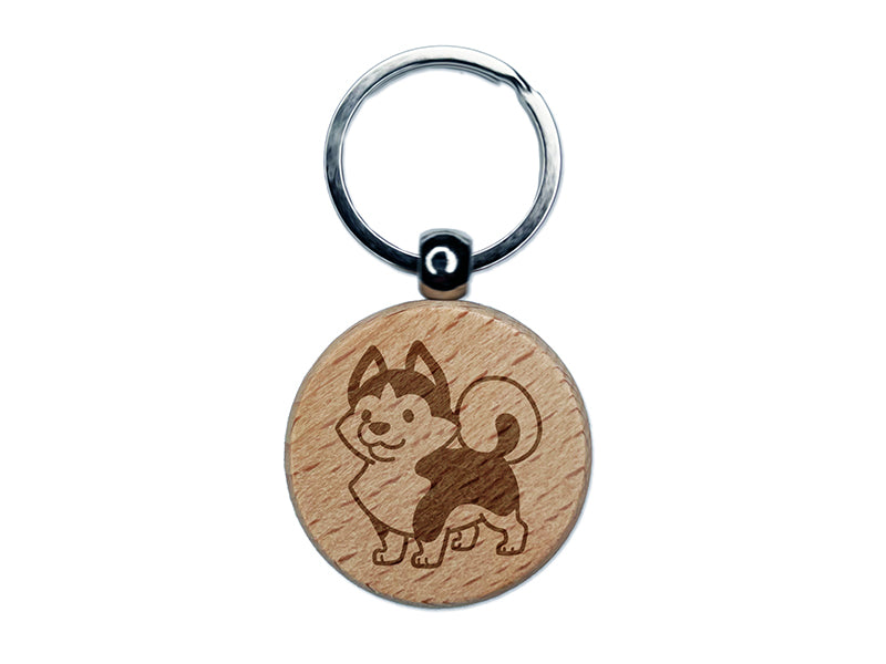 Siberian Husky Standing Dog Engraved Wood Round Keychain Tag Charm