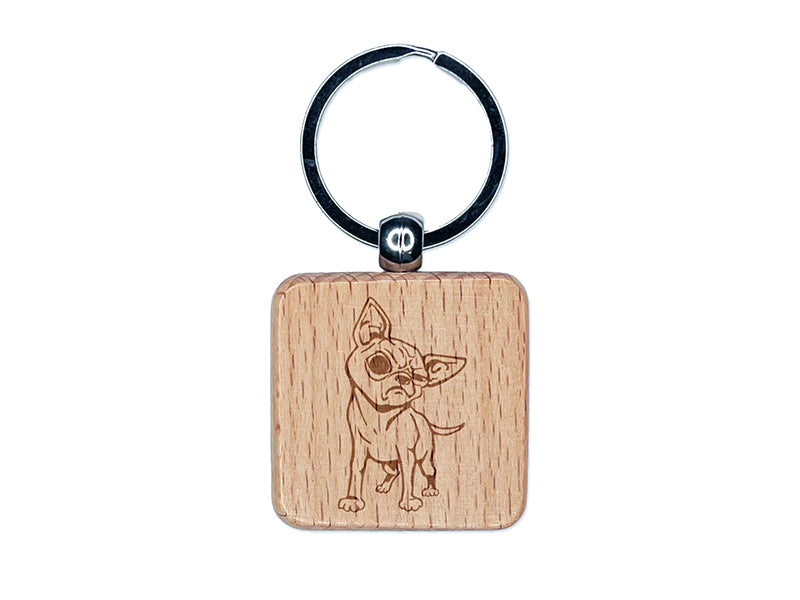 Suspicious Chihuahua Dog Engraved Wood Square Keychain Tag Charm