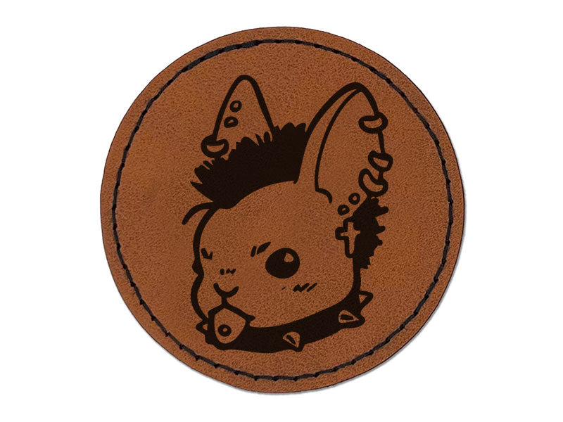 Punk Rock Bunny Rabbit with Mohawk and Piercings Round Iron-On Engraved Faux Leather Patch Applique - 2.5 Inch