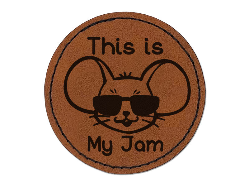 This Is My Jam Mouse Sunglasses Big Ears Cute Round Iron-On Engraved Faux Leather Patch Applique - 2.5 Inch - Brown