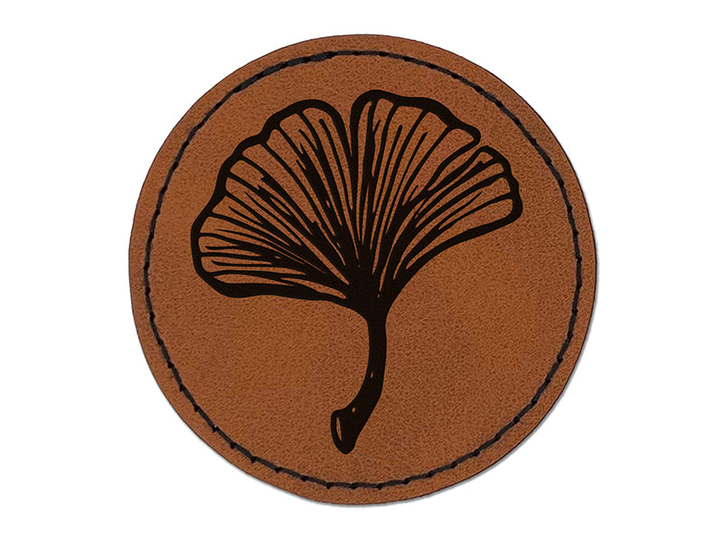 Hand Drawn Ginkgo Leaf Doodle Round Iron-On Engraved Faux Leather Patch Applique - 2.5"