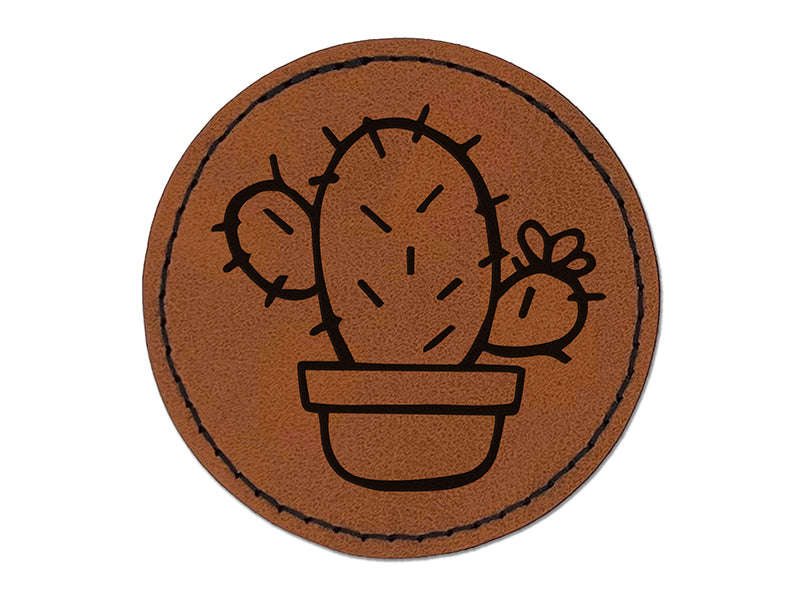 Hand Drawn Prickly Pear Cactus Doodle Round Iron-On Engraved Faux Leather Patch Applique - 2.5"