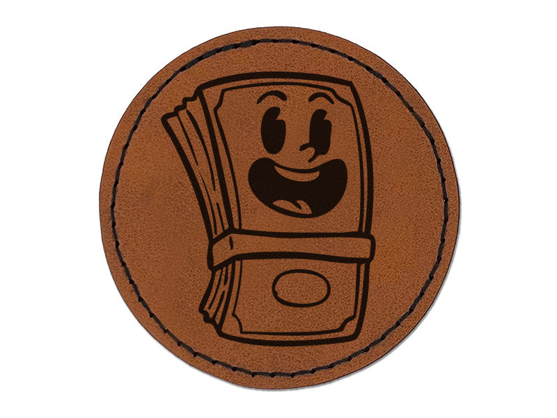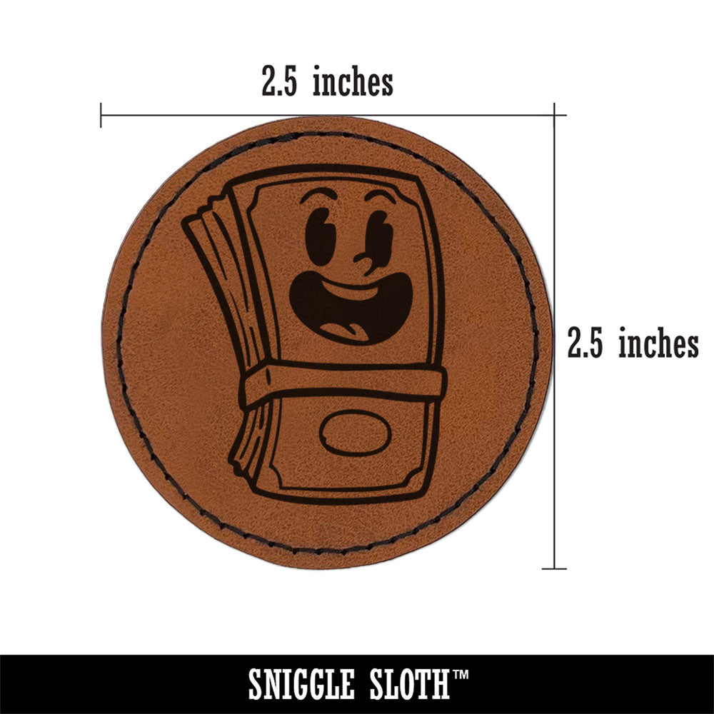 Cartoon Stack of Money Cash Happy Dollar Bill Round Iron-On Engraved Faux Leather Patch Applique - 2.5 Inch