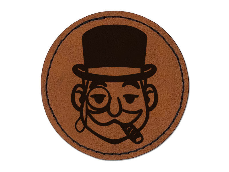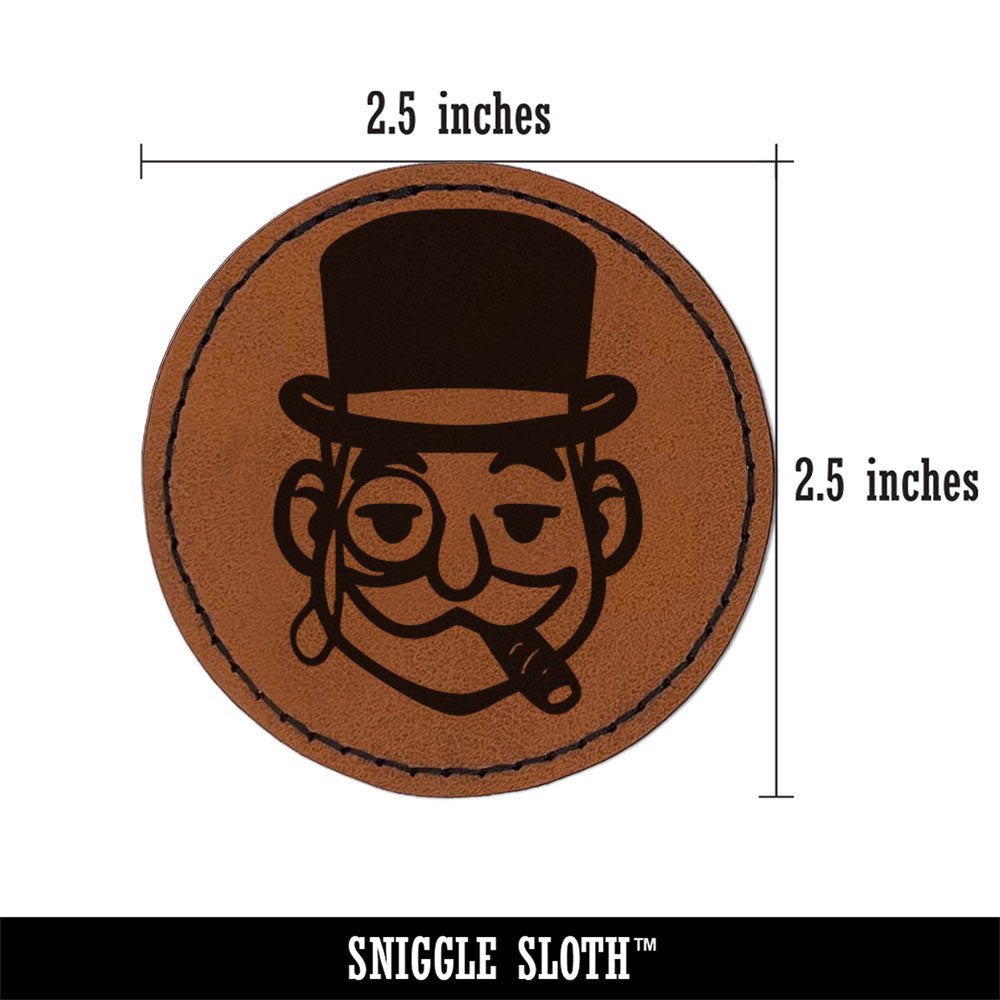 Rich Man Top Hat Mustache Tycoon Cigar Round Iron-On Engraved Faux Leather Patch Applique - 2.5 Inch