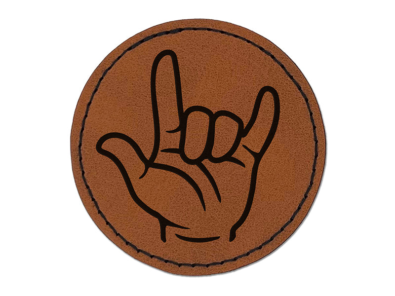 I Love You Hand Sign Language Round Iron-On Engraved Faux Leather Patch Applique - 2.5"
