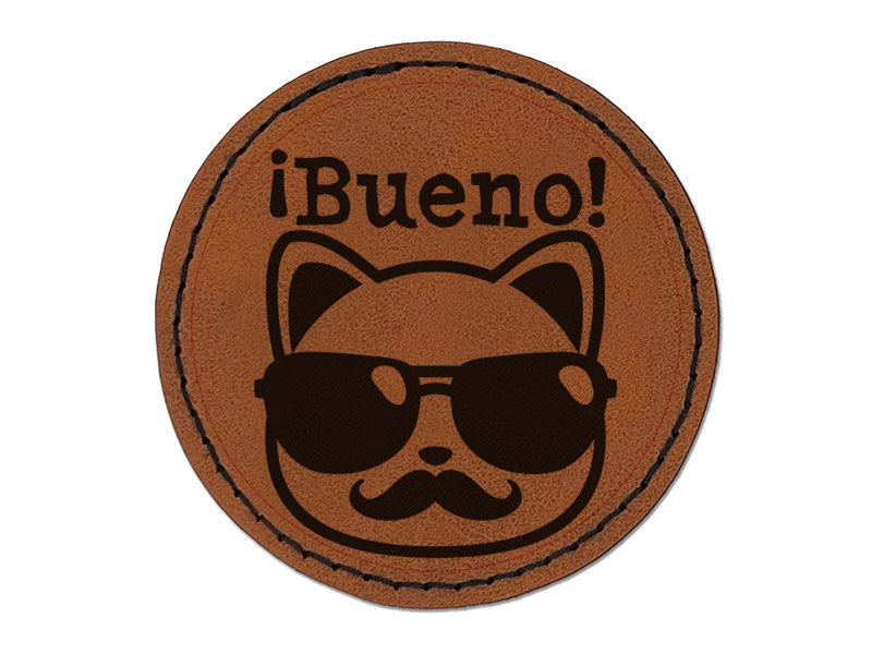 Bueno Cat Sunglasses Spanish Teacher Class School Round Iron-On Engraved Faux Leather Patch Applique - 2.5 Inch