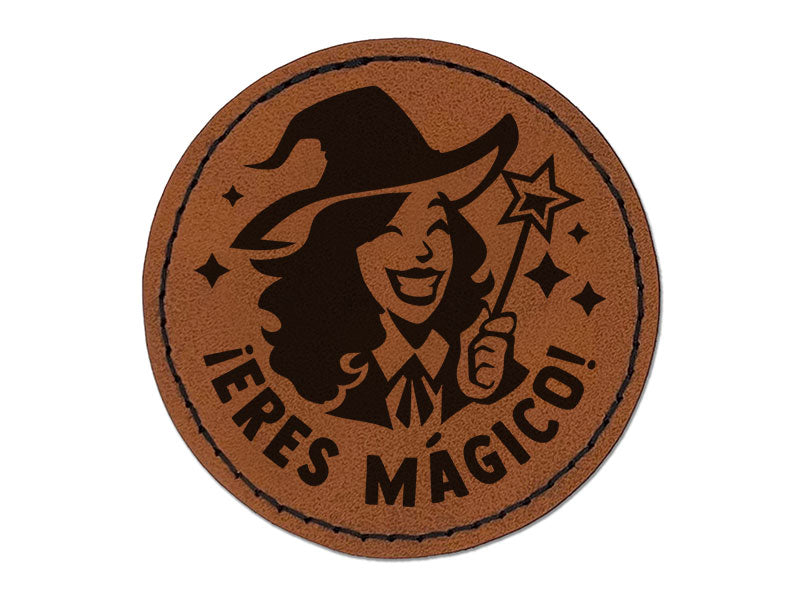 Eres Magico Magical Witch Spanish Compliment Teacher Stamp Round Iron-On Engraved Faux Leather Patch Applique - 2.5 Inch