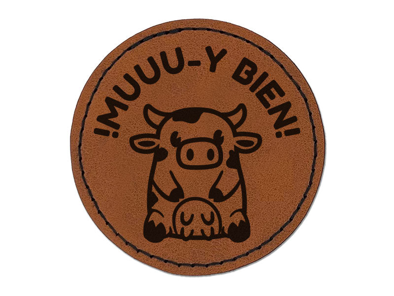 Muy Bien Cow Spanish Pun Funny Very Good Compliment Round Iron-On Engraved Faux Leather Patch Applique - 2.5 Inch