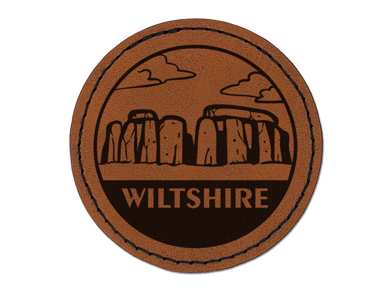 Wiltshire England Stonehenge Landmark Destination Circle Round Iron-On Engraved Faux Leather Patch Applique - 2.5 Inch