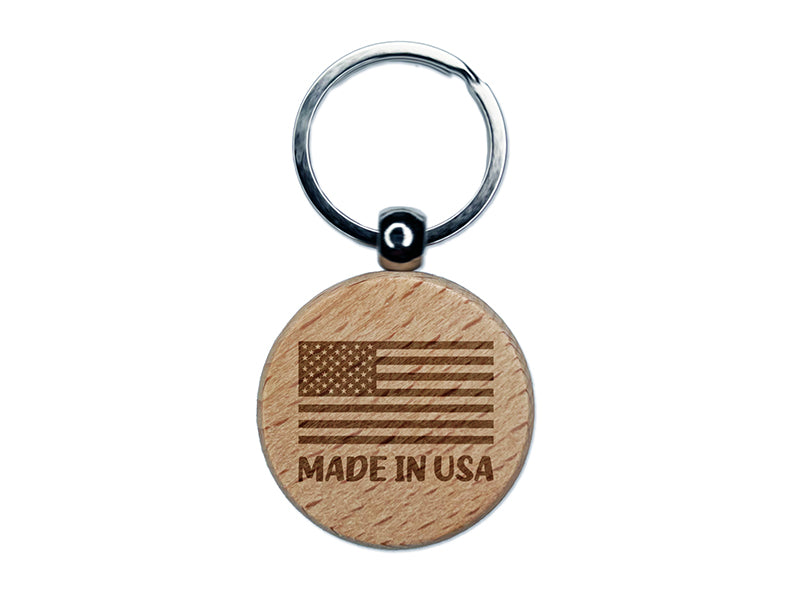 Made in USA America Flag Engraved Wood Round Keychain Tag Charm