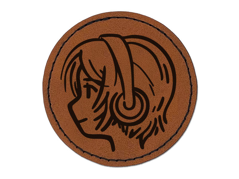 Anime Girl Earphones Short Hair Music Round Iron-On Engraved Faux Leather Patch Applique - 2.5 Inch
