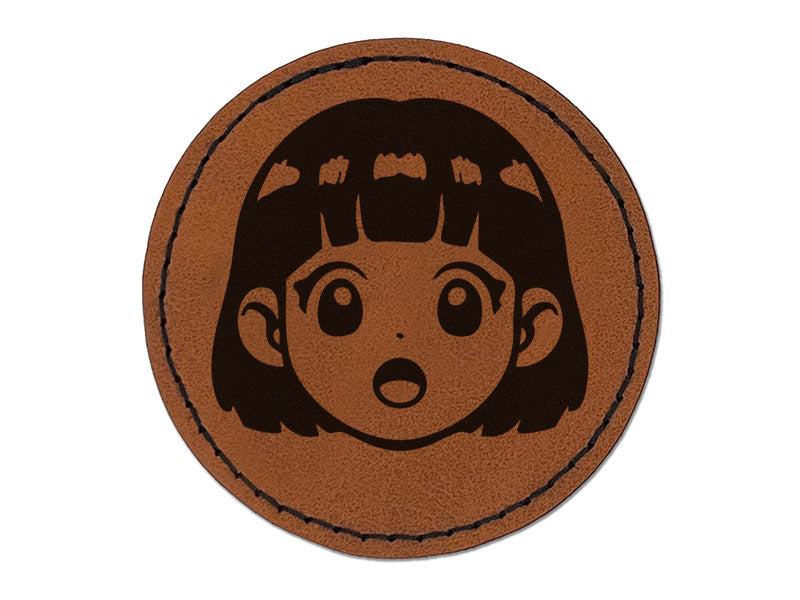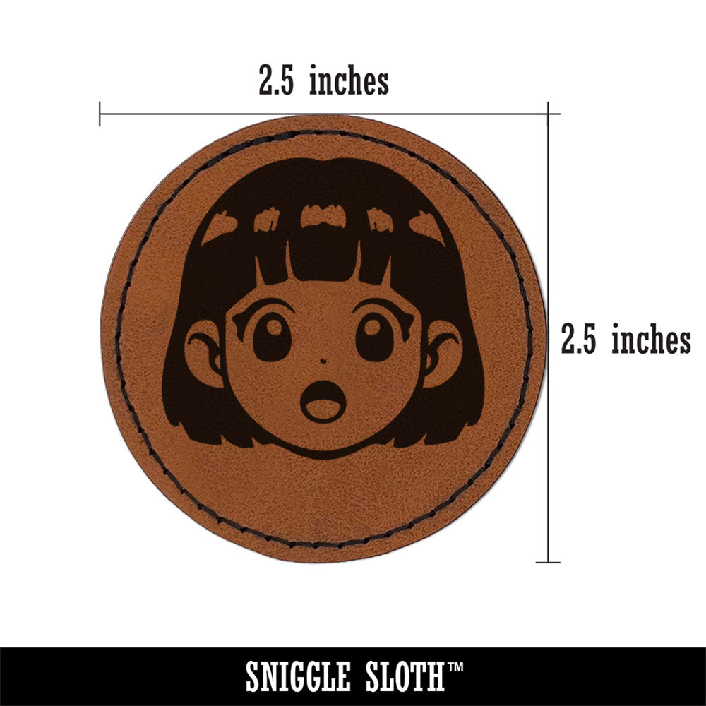 Anime Manga Girl Shocked Surprised Cute Round Iron-On Engraved Faux Leather Patch Applique - 2.5 Inch