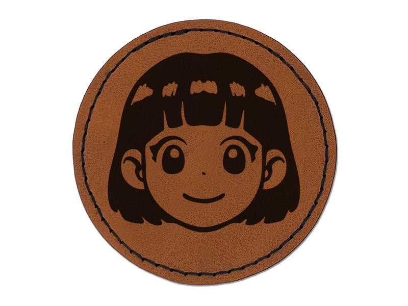 Anime Manga Girl Smile Cute Round Iron-On Engraved Faux Leather Patch Applique - 2.5 Inch