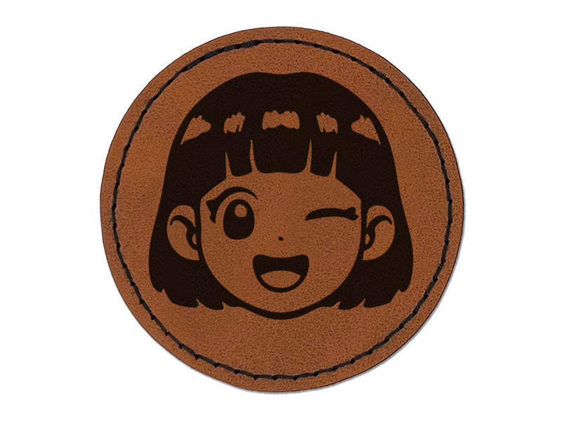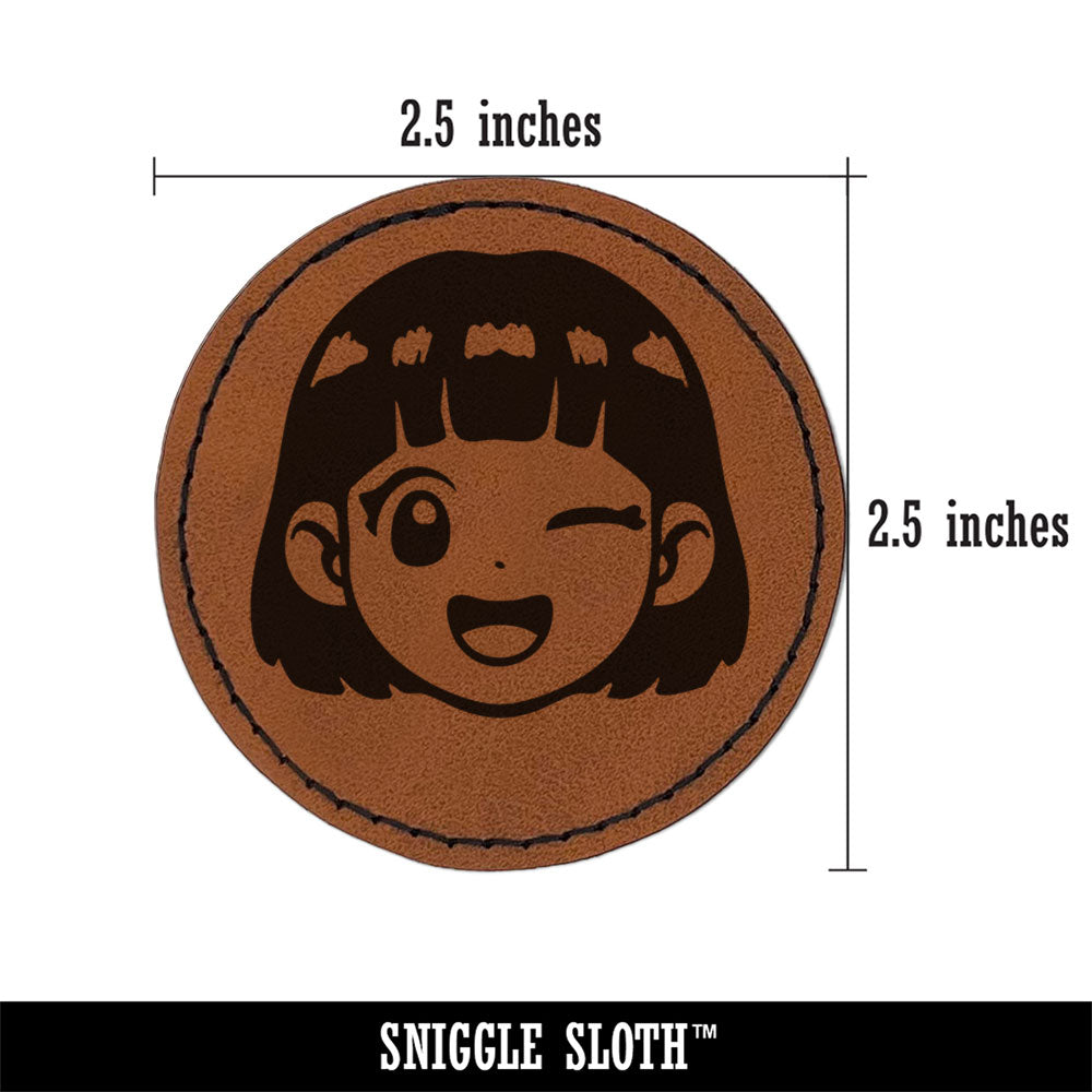 Anime Manga Girl Wink Happy Cute Round Iron-On Engraved Faux Leather Patch Applique - 2.5 Inch