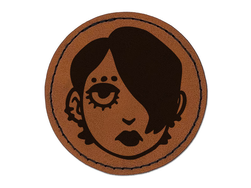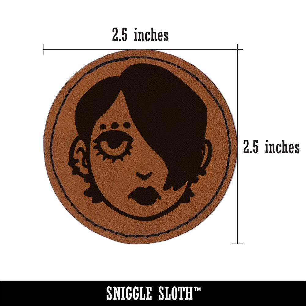 Emo Goth Woman Head Person Round Iron-On Engraved Faux Leather Patch Applique - 2.5 Inch