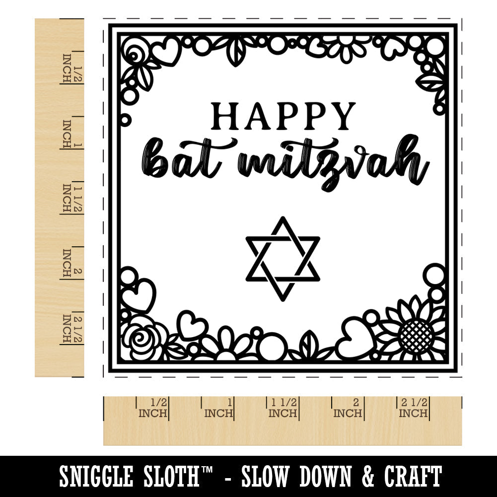 Happy Bat Mitzvah Sweet Floral Border 13th Birthday for Jewish Girl Square Rubber Stamp for Stamping Crafting