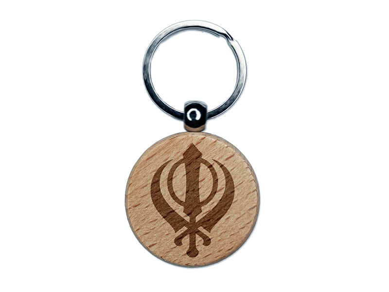 Sikh Khanda Indian Punjab Religious Symbol Engraved Wood Round Keychain Tag Charm