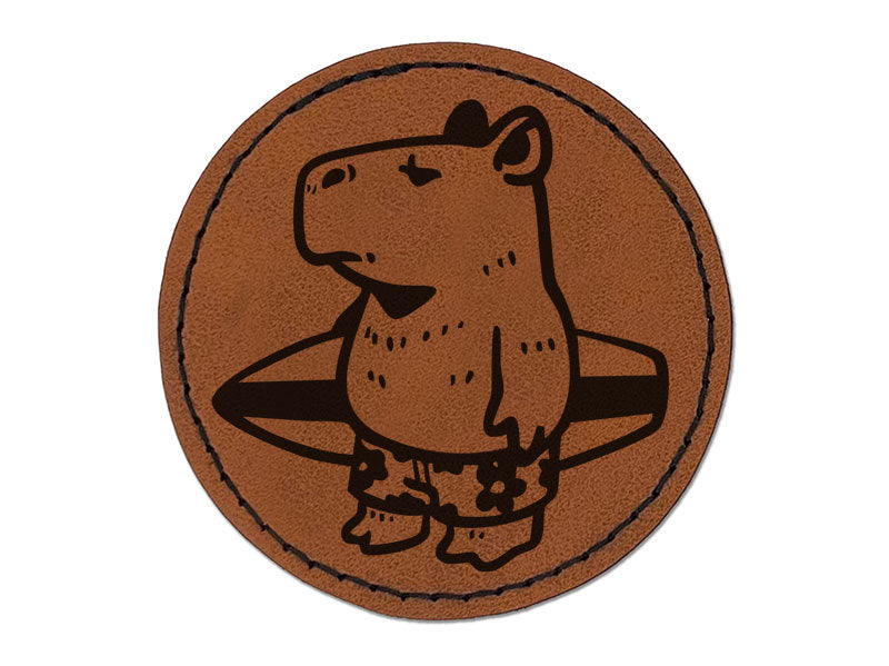 Cartoon Capybara With Surfboard and Swim Shorts Round Iron-On Engraved Faux Leather Patch Applique - 2.5 Inch