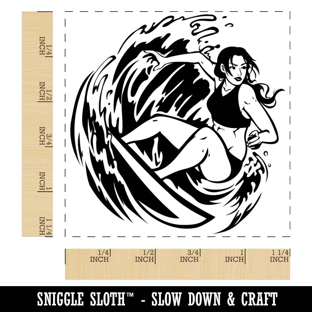 Surfer Woman Riding Wave with Surfboard Square Rubber Stamp for Stamping Crafting
