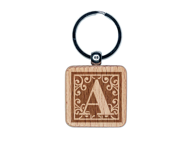 Monogram Swirls Capital Letter A Engraved Wood Square Keychain Tag Charm
