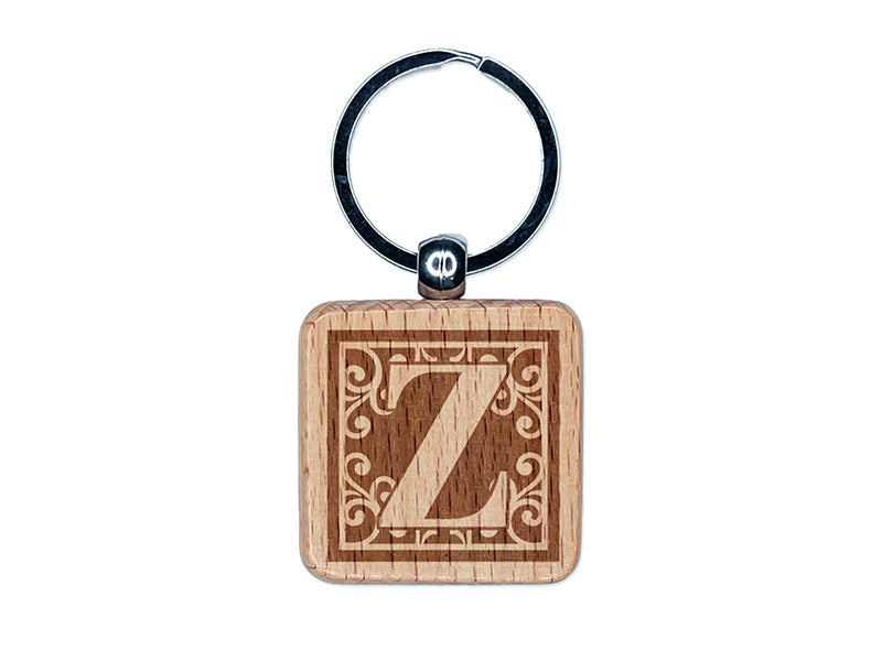 Monogram Swirls Capital Letter Z Engraved Wood Square Keychain Tag Charm