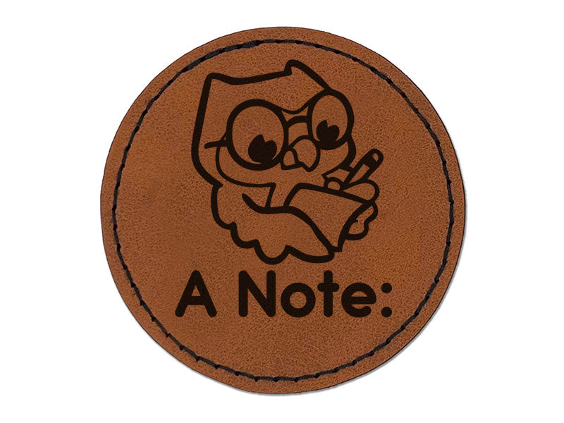 A Note Nerdy Owl Notebook Student Teacher School Round Iron-On Engraved Faux Leather Patch Applique - 2.5 Inch - Brown